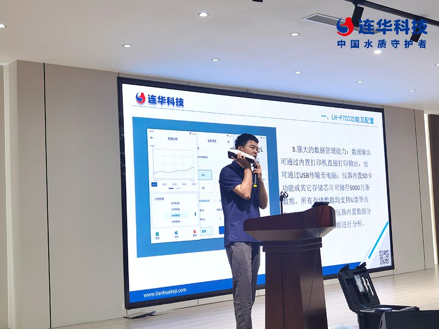 培訓過程中,連華科技作為業內知名的水質檢測儀器及耗材生產廠家,對清瀾系列便攜式水質測定儀LH-P700進行了詳細的介紹和培訓。上午的理論培訓環節,連華科技技術人員對水質測定儀的原理、功能、常規污染指標實驗操作方法及注意事項進行了全面系統的講解,讓參訓人員對LH-P700這款水質測定儀有了更加深入的了解。
