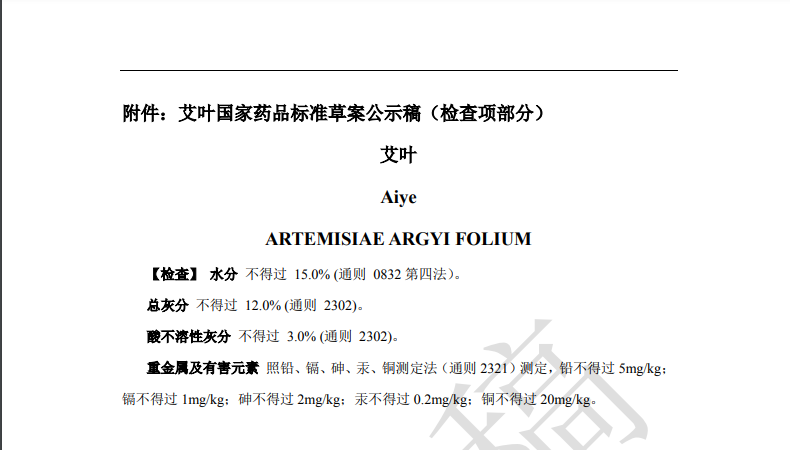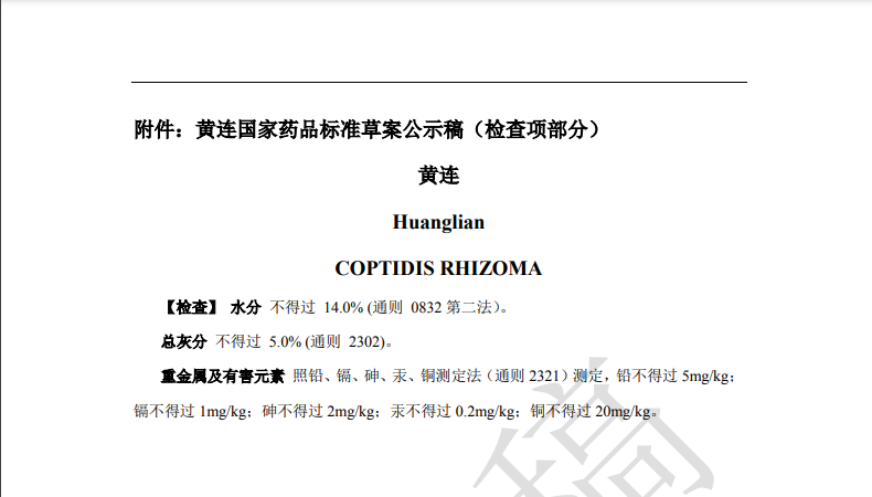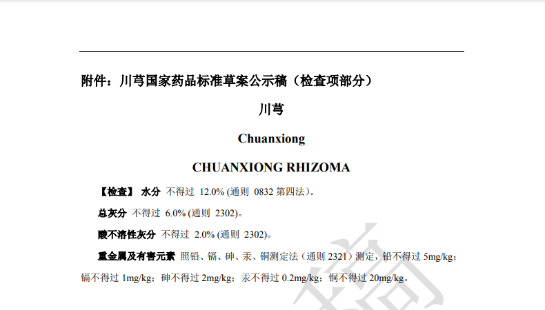 本次草案修訂,主要是根據產品重金屬及有害元素蓄積及與土壤相關性研究結果,擬新增重金屬與有害元素檢查項。均要求【重金屬及有害元素】照鉛、鎘、砷、汞、銅測定法(通則2321)測定,鉛不得過 5mg/kg;鎘不得過1mg/kg;砷不得過2mg/kg;汞不得過 0.2mg/kg;銅不得過 20mg/kg。