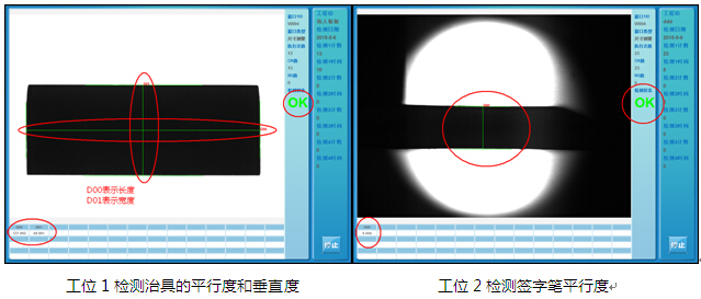 西安海克易邦光電科技有限公司基于機器視覺圖像處理技術研發的簽字筆平行度檢測,具有高精度、高速、多樣品化的特點。系統主要模塊有:觸發模塊、引導模塊。根據用戶需求,檢測簽字筆與治具的水平度和垂直度,遂需要雙工位檢測才能完成檢測需求,將樣品移動到檢測位,觸發相機并及時對視覺系統輸出檢測信號,從而完成檢測功能。